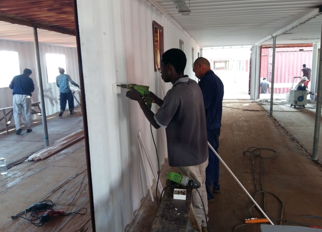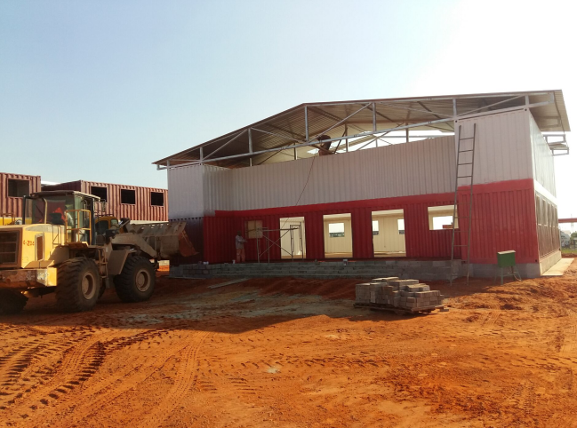 機(jī)械設(shè)備的不足及各種原材料的短缺嚴(yán)重制約著施工生產(chǎn)的開展。項目部分管物資工作的李永順從開始百年職校圖紙設(shè)計時就一再強(qiáng)調(diào)物資供應(yīng)對施工生產(chǎn)的重要影響,他從公司在山東章丘創(chuàng)辦的房屋建筑產(chǎn)業(yè)化示范基地得到啟發(fā),果斷地向中信建設(shè)非洲區(qū)指揮中心提出了具有革新性的意見:整個百年職校的主體建筑采用大量閑置的集裝箱改裝而成,所有的集裝箱首先經(jīng)過加工處理,被切割成標(biāo)準(zhǔn)的房屋建筑構(gòu)件、配件,然后被焊接組裝在一起。這個建議馬上得到了中信建設(shè)方面的充分肯定和高度贊揚,這樣一來,既解決了大量閑置堆放的集裝箱難以妥善處理問題,實現(xiàn)了物資材料的循環(huán)利用,又節(jié)約了建筑成本,彌補(bǔ)了建筑材料的相對緊缺,還大大提高了施工生產(chǎn)效率,成為公司走建筑產(chǎn)業(yè)化道路的又一次積極探索。