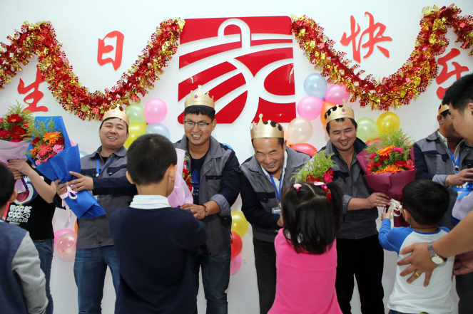 項(xiàng)目部駐地職工餐廳里,五彩的掛花、繽紛的氣球,紅彤彤的“生日快樂(lè)”四個(gè)大字,營(yíng)造出溫馨祥和的家文化氛圍,這里在舉辦項(xiàng)目部每月一次的職工生日宴,項(xiàng)目部邀請(qǐng)小客人和家屬參加,大大的蛋糕讓孩子們興奮不已。孩子們和職工們一起唱生日歌、和壽星們一起吹蠟燭,并為9位壽星送上鮮花與祝福。看著小朋友們燦爛的笑臉,有幾個(gè)職工想起自己家里的孩子,默默出去打電話(huà),祝孩子節(jié)日快樂(lè)。