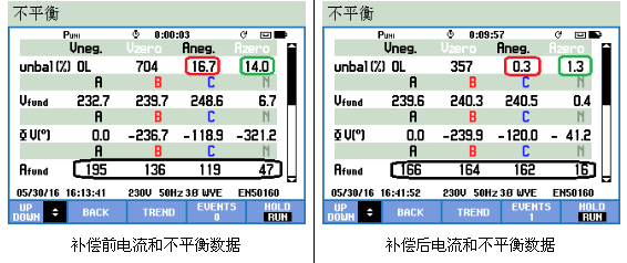 本投運(yùn)項(xiàng)目,應(yīng)用于一臺(tái)180kVA的變壓器,該臺(tái)區(qū)負(fù)荷的三相不平衡度較大,通過(guò)雙杰電氣的STUR對(duì)三相不平衡進(jìn)行有效的治理,其負(fù)序不平衡度由16.7%下降至0.3%、零序不平衡度由14%下降至1.3%,零線電流由47A下降至16A、三相電流由195A、136A、119A調(diào)整至166A、164A、162A。其具體數(shù)據(jù)如下: