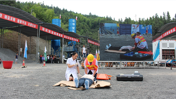 正在大樹村2號(hào)大橋5號(hào)墩蓋梁模板拆除施工的作業(yè)工人黃某未將安全帶正確固定,不慎從5號(hào)墩蓋梁操作平臺(tái)“墜落”。應(yīng)急指揮部立即啟動(dòng)高處墜落應(yīng)急救援預(yù)案,迅速展開救援工作。在醫(yī)療人員的接應(yīng)下送往急救車,由于搶救方案正確,應(yīng)急反應(yīng)及時(shí),方法得當(dāng),3名傷員經(jīng)醫(yī)院檢查救治,均無生命危險(xiǎn)。三江縣中醫(yī)院急救專家趙紅芬在演練現(xiàn)場(chǎng)進(jìn)行了模擬真人演練,一面講解一面做示范。