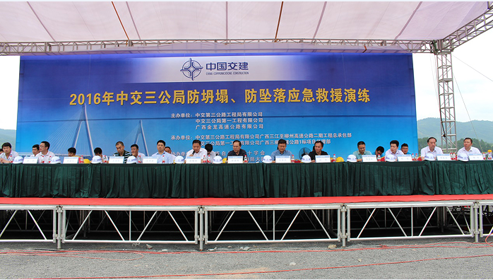 (記者 ??? 通訊員 祁云翠)6月24日,中交三公局在一公司廣西三柳1標(biāo)項(xiàng)目大樹村隧道口舉行了2016年隧道坍塌事故及高處墜落事故應(yīng)急演練,這是近年來三公局舉行的最大規(guī)模的應(yīng)急救援演練活動(dòng)。局副總經(jīng)理張耀強(qiáng)、安全總監(jiān)侯建剛出席并觀摩演練。廣西三江侗族自治縣公安消防大隊(duì)、三江縣侗族自治縣紅十字會(huì)為本次應(yīng)急演練聯(lián)動(dòng)單位參加演練,廣西柳州電視臺(tái)進(jìn)行了全程播報(bào)。