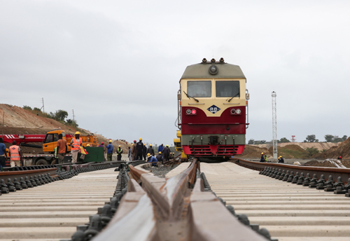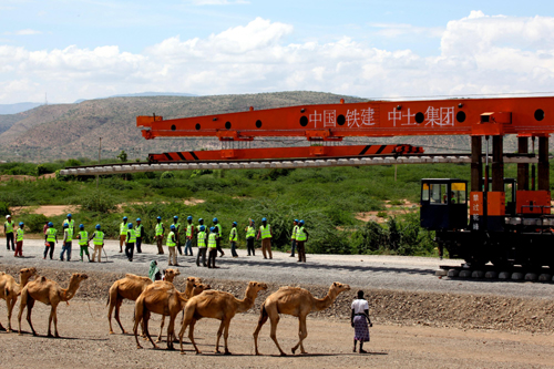 這是2014年4月27日中國鐵建中土集團的工人在埃塞俄比亞德雷達瓦進行亞吉鐵路先期鋪軌作業(yè)的資料照片。亞吉鐵路全長752.7公里,于2010年9月開始設計建造,設計時速120公里,由中國中鐵和中國鐵建組織施工。鐵路建成后,亞的斯亞貝巴至吉布提運輸時間從公路運輸?shù)?日降至10小時,這條鐵路將成為埃塞俄比亞重要的出海運輸通道。新華社發(fā)(劉渝 攝)