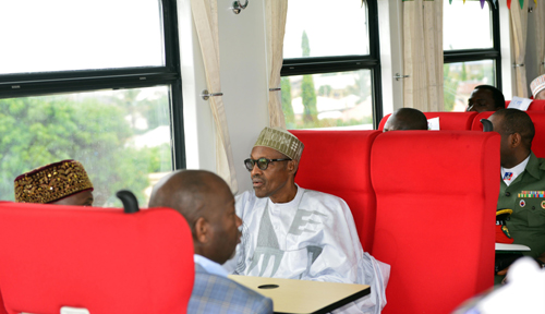 2016年7月26日,在尼日利亞首都阿布賈西郊伊都火車站,尼日利亞總統(tǒng)布哈里(中)試乘阿卡鐵路客車。2006年10月,中土公司與尼日利亞簽署尼日利亞鐵路現(xiàn)代化項目。該項目南起尼最大城市、經(jīng)濟中心拉各斯,途經(jīng)首都阿布賈,北至北部重鎮(zhèn)卡諾,線路全長1315公里。阿卡鐵路于2011年開工建設,并于2016年7月正式運營通車。新華社發(fā)(楊鴻杰 攝)
