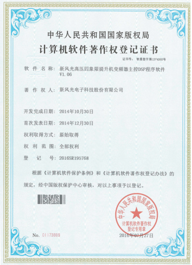 近日,由新風(fēng)光電子科技股份有限公司(以下簡(jiǎn)稱(chēng)新風(fēng)光)自主開(kāi)發(fā)的 “高壓提升機(jī)變頻器主控DSP程序軟件V1.06”順利通過(guò)國(guó)家版權(quán)局的審查,獲得國(guó)家版權(quán)局頒發(fā)的計(jì)算機(jī)軟件著作權(quán)登記證書(shū)。證書(shū)號(hào)為:軟著登字第1374385號(hào)。這是新風(fēng)光在軟件著作權(quán)方面取得的又一新的成績(jī)。