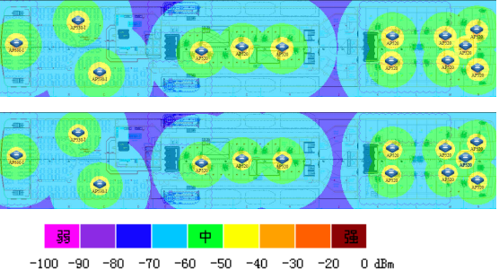郵輪5層的信號(hào)覆蓋強(qiáng)度熱圖(上2.4GHZ,下5GHz)