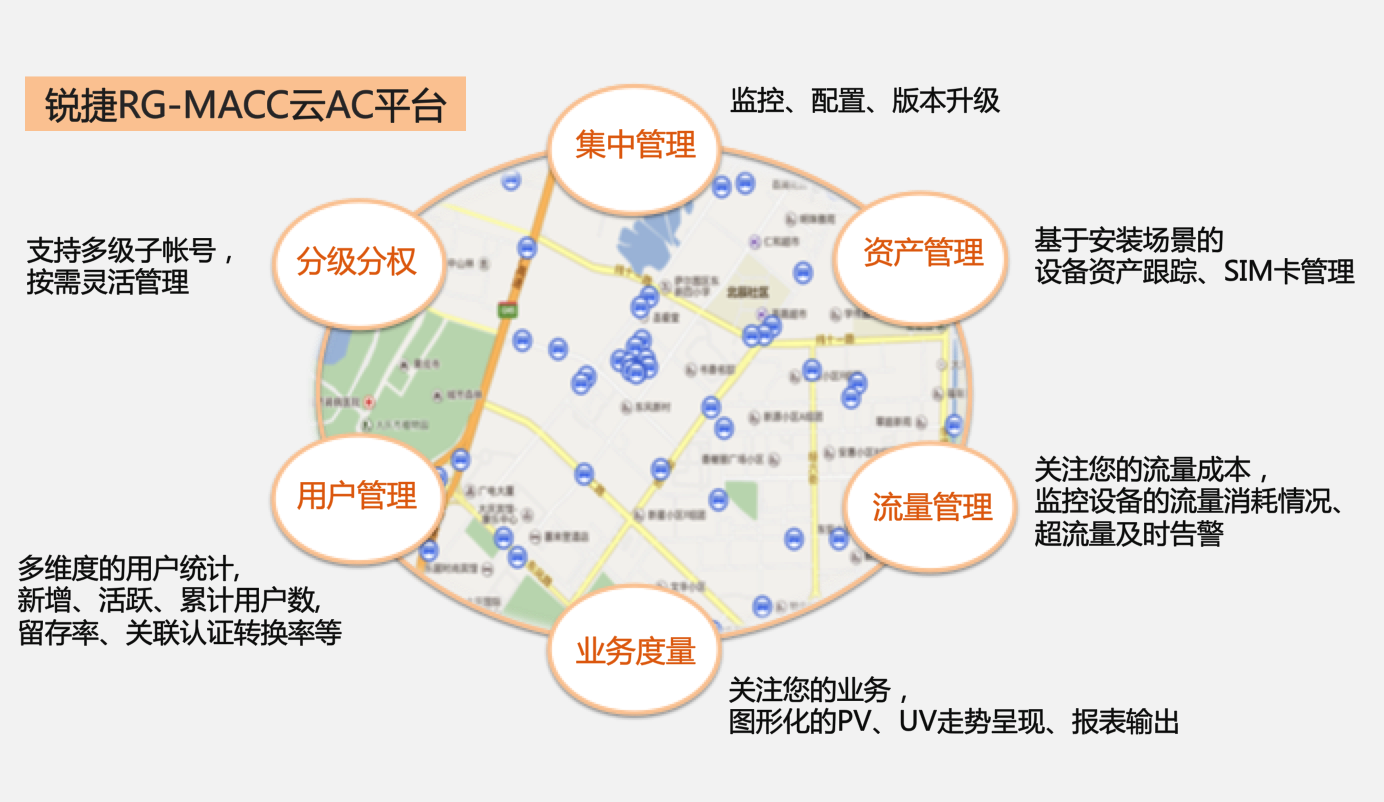在運營管理方面,借助銳捷RG-MACC云AC搭建運維管理平臺,運維管理人員可以輕松實現(xiàn)產(chǎn)品資產(chǎn)管理、用戶管理、流量管理、業(yè)務(wù)度量、大數(shù)據(jù)分析等,解決運維管理人員的擔(dān)憂和顧慮。