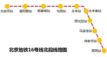 此次開(kāi)通的16號(hào)線北段共開(kāi)放9座車站,自北向南分別為北安河站、溫陽(yáng)路站、稻香湖路站、屯佃站、永豐站、永豐南站、西北旺站、馬連洼站、西苑站。其中,有一座換乘車站西苑站,可實(shí) 現(xiàn)16號(hào)線與4號(hào)線的換乘。兩線通過(guò)兩條約6米寬、120米長(zhǎng)的Y形通道連通。