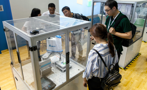 圖1 在第6屆中國國際機器人展覽會上,工業(yè)自動化領導廠商臺達展出SCARA工業(yè)機器人DRS40L、DRS60L系列,垂直多關(guān)節(jié)工業(yè)機器人DRV90L系列以及桁架式機械手控制解決方案、高速分揀展示線解決方案等